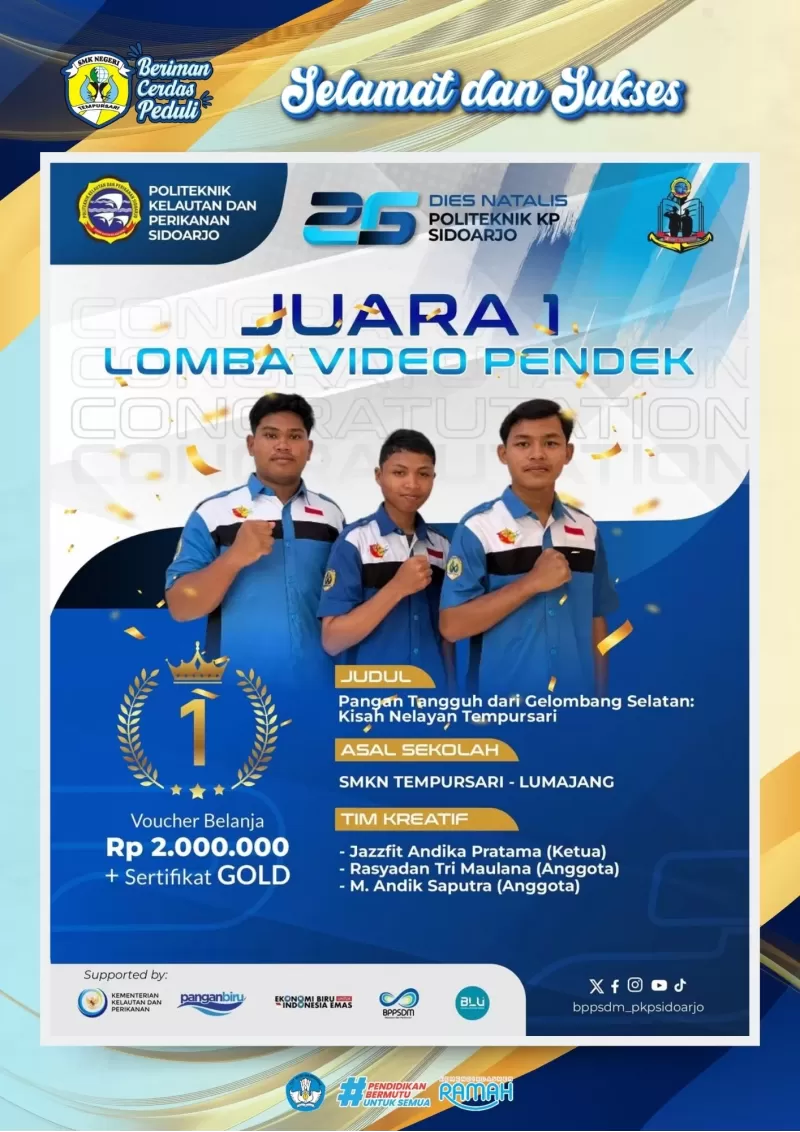 Selamat! Lomba Video Pendek dengan tema "Pangan Biru, Pangan Tangguh" telah mengumumkan pemenangnya, di mana Juara 1 berhasil diraih oleh tim dari Kelas XI Agribisnis Perikanan Air Tawar SMK Negeri Tempursari yang diketuai oleh Jazfit dkk. Karya mereka yang berjudul "Pangan Tangguh dari Gelombang Selatan: Kisah Nelayan Tempursari" dinilai paling unggul dan inspiratif dalam membahas subtema Ketahanan Pangan dari Laut, menunjukkan potensi besar pangan yang berasal dari kisah nyata nelayan di wilayah Tempursari.